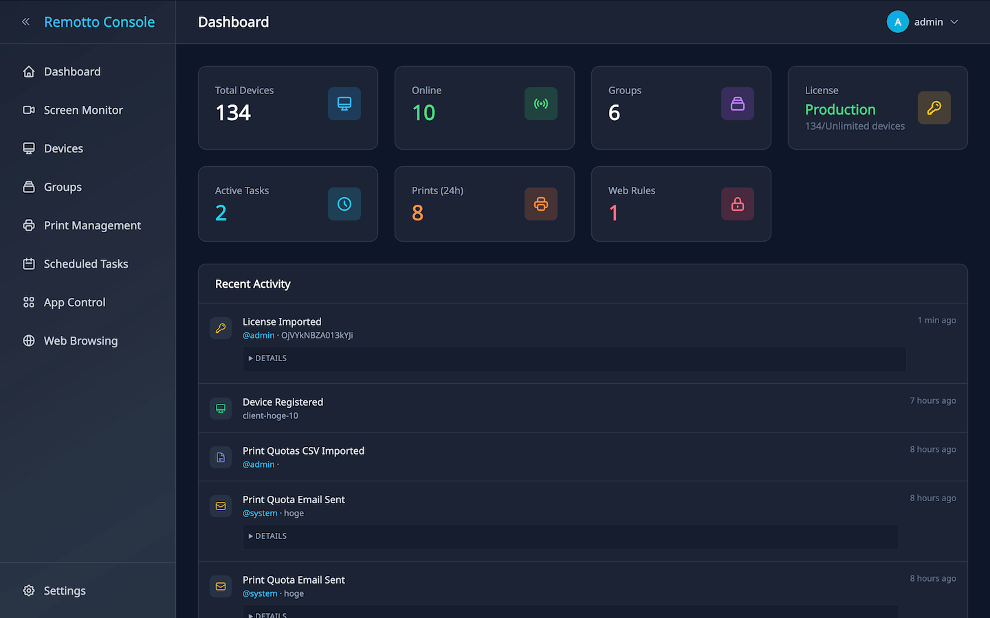 Recent Activity — Displays admin operation history (who, when, and what was done) in chronological order.