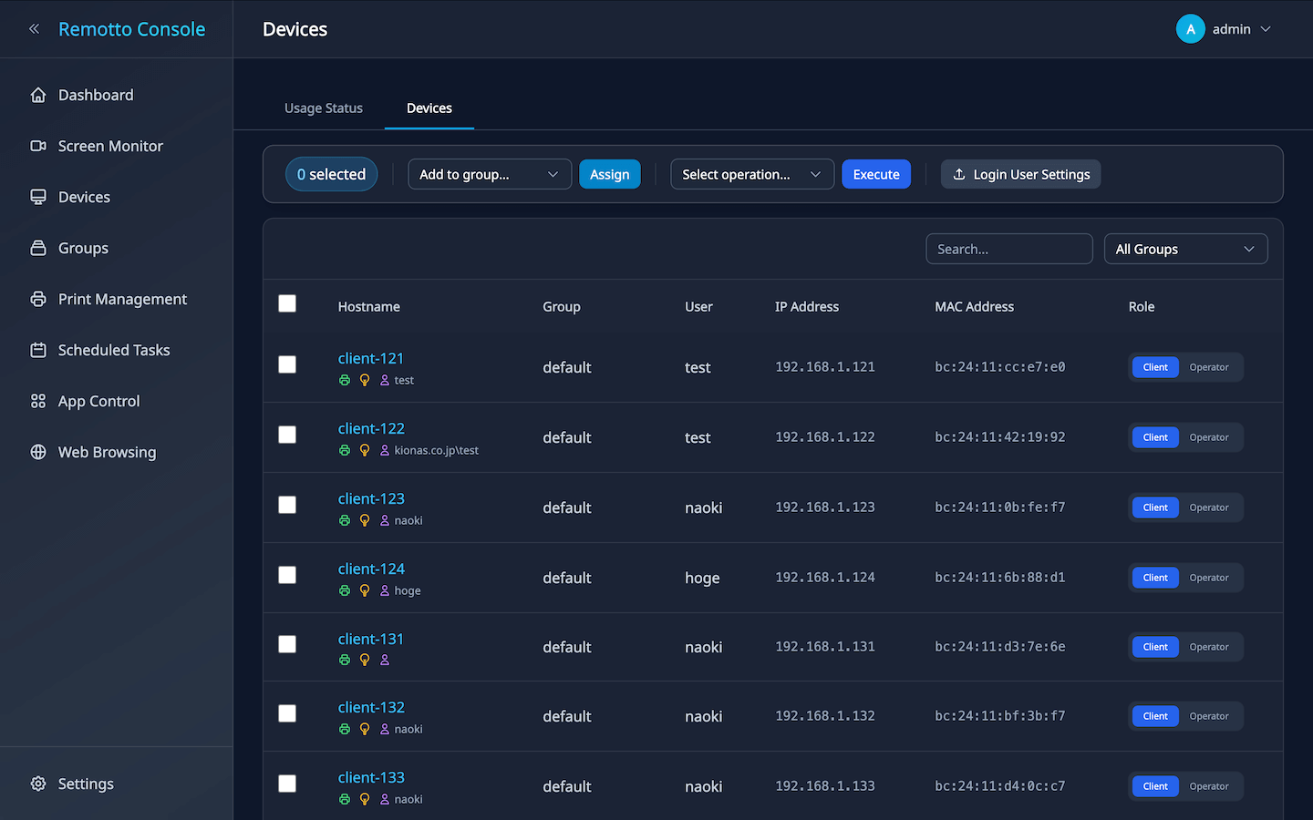 All registered devices are displayed in a table. Each row shows hostname, group, logged-in user, IP address, MAC address, and role.