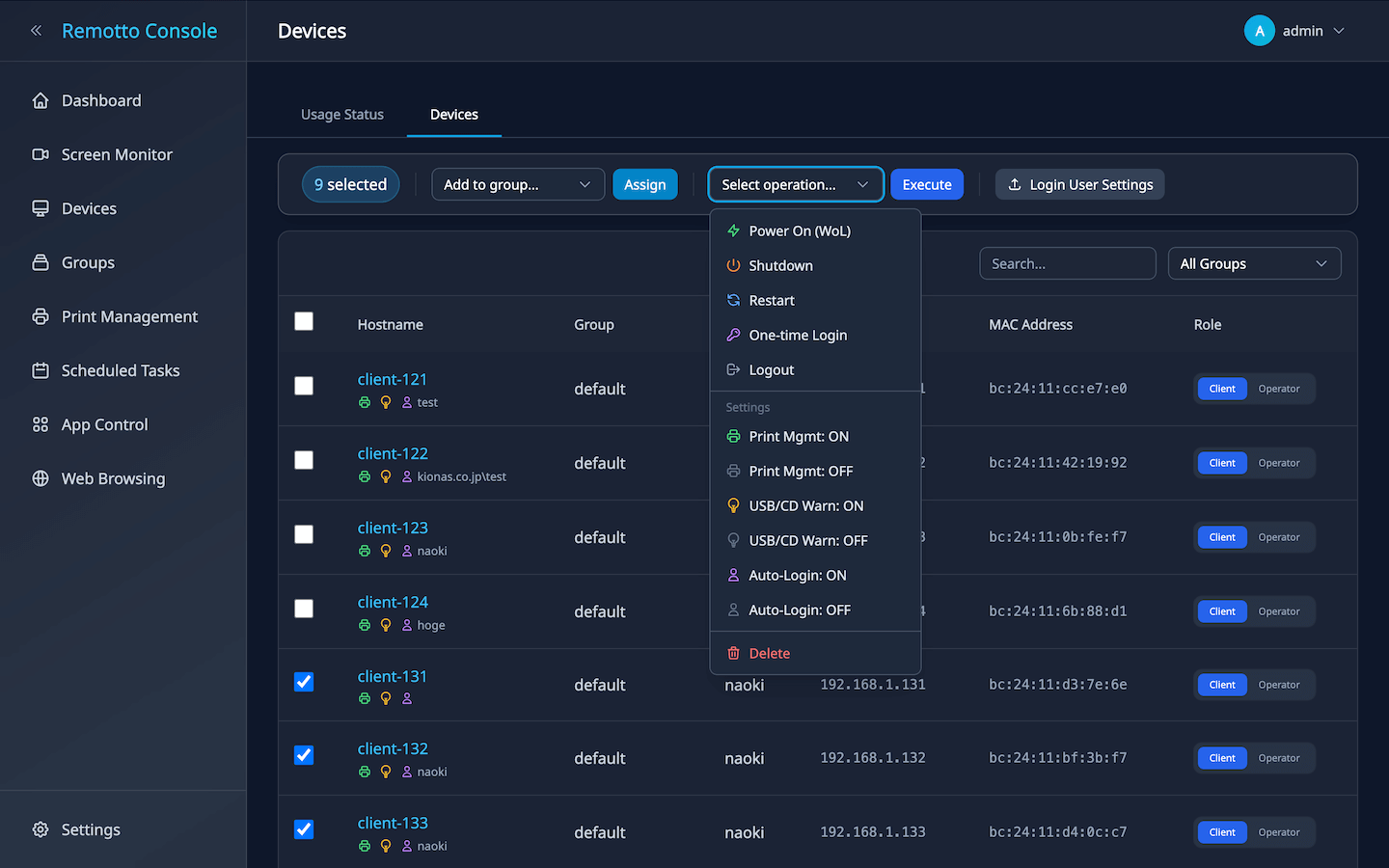 • Bulk Operations: Select multiple devices with checkboxes to perform power operations, group assignment, settings changes, or deletion