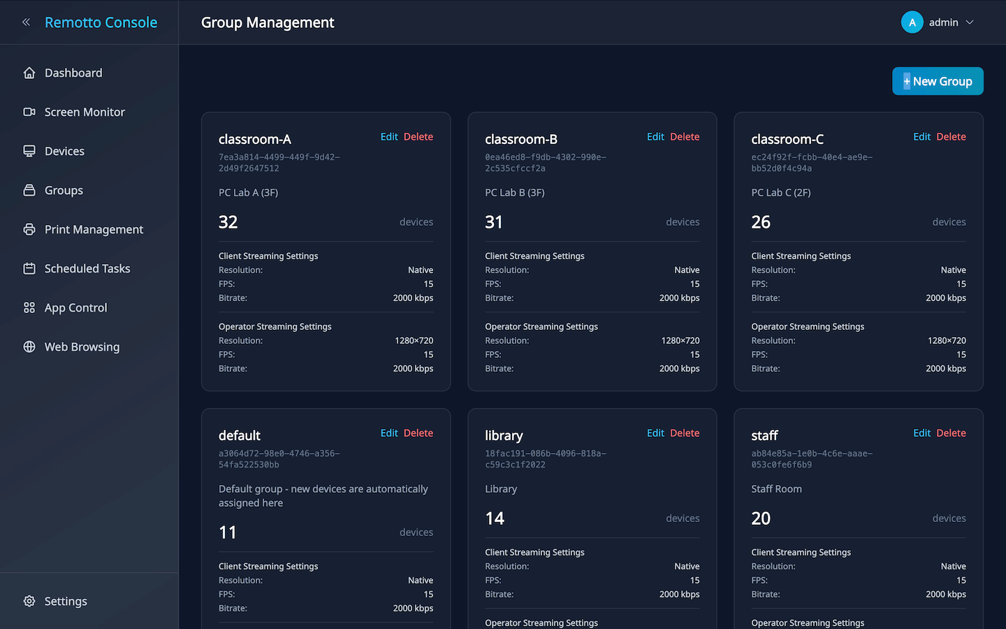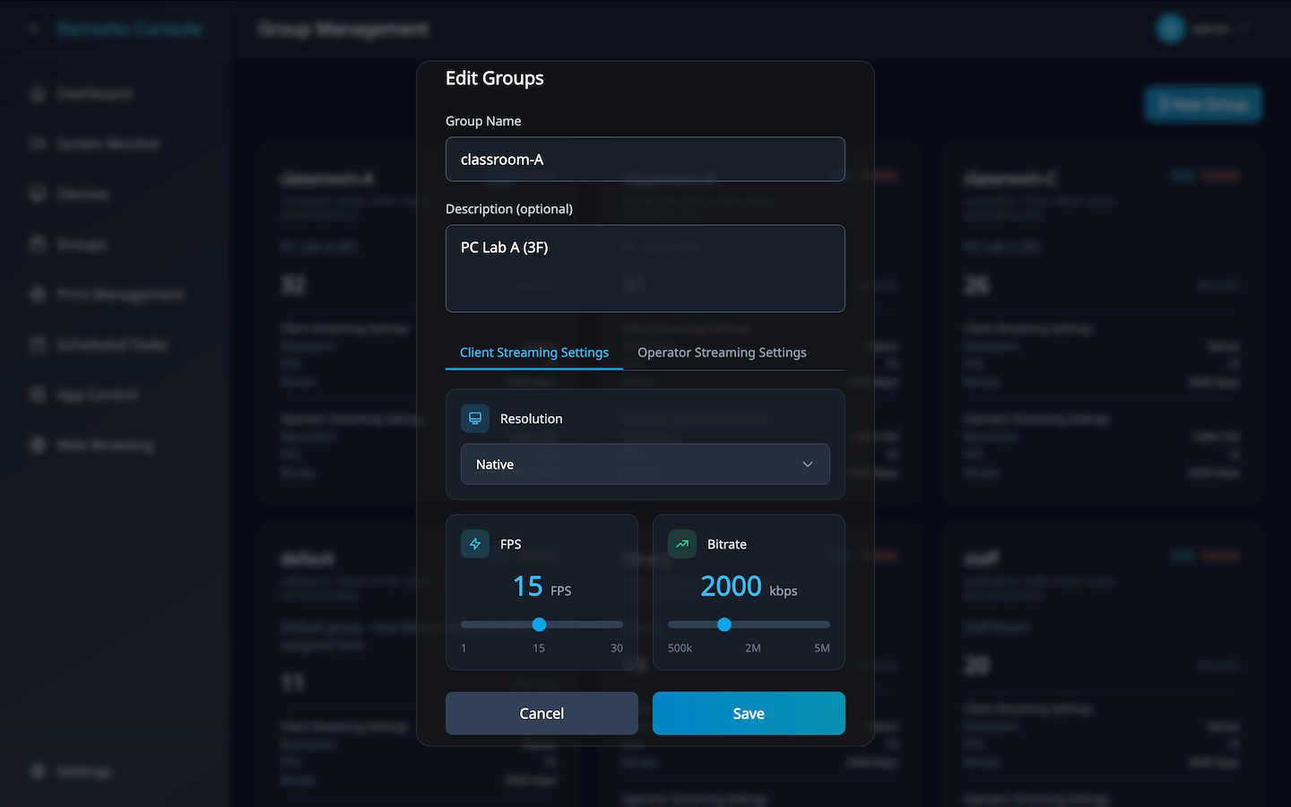 Organize devices into groups. Set streaming quality per group and apply to all member devices.