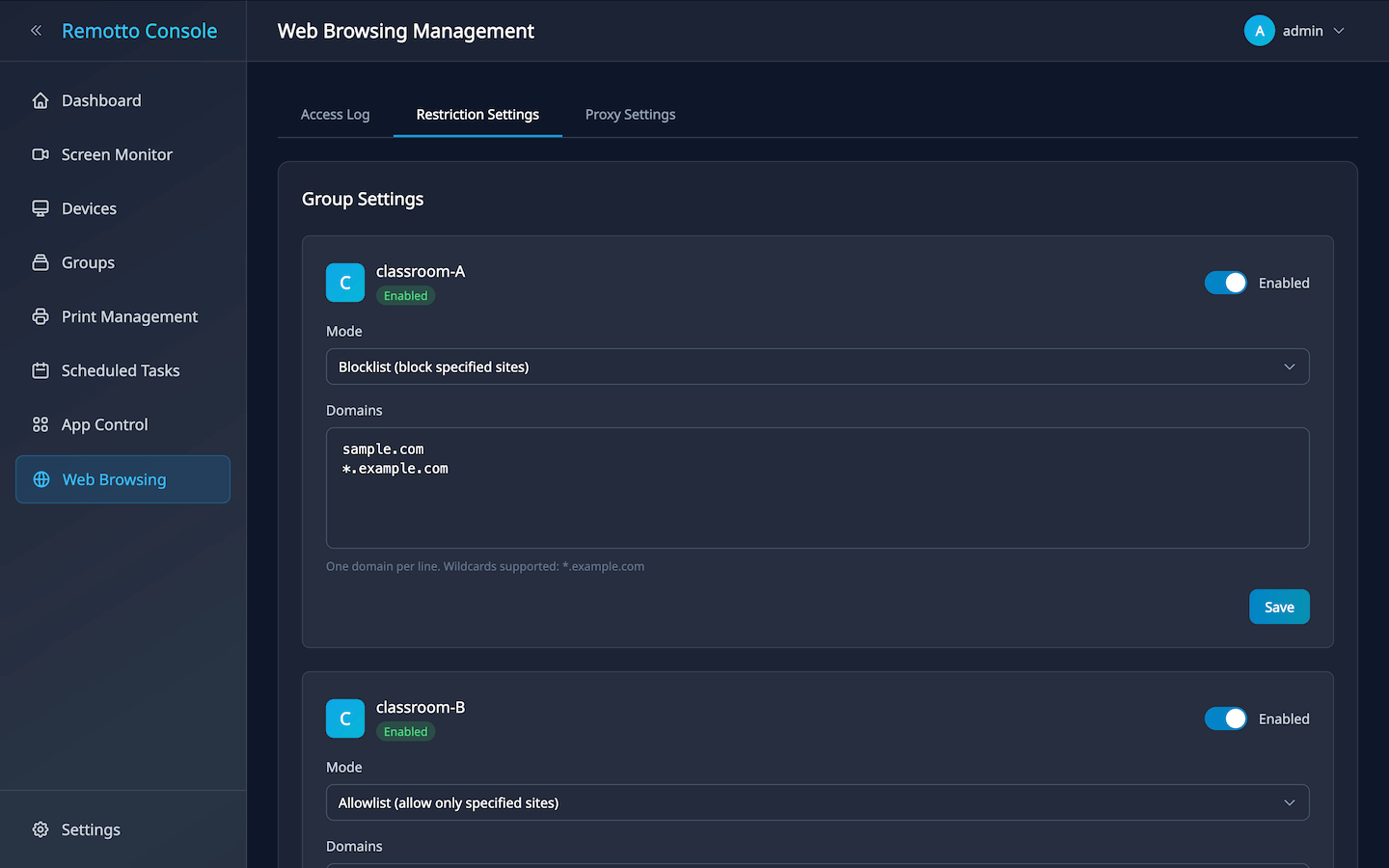 From the admin console’s “Monitor” screen, view client device screens in real-time right in your browser — no need to install Remotto Viewer.
