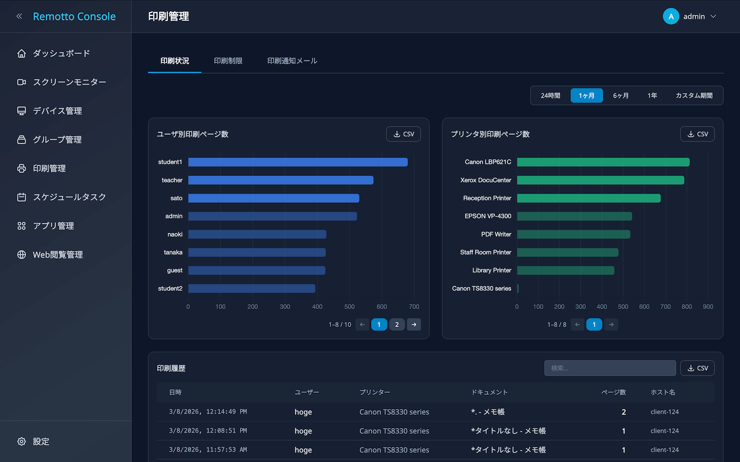 - 印刷ページ数(24時間): 直近24時間に印刷されたページの合計