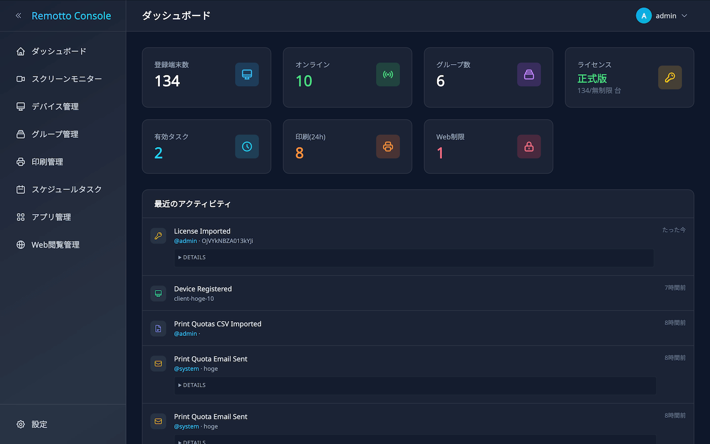 最近のアクティビティ — 管理操作の履歴(誰が・いつ・何を操作したか)を時系列で表示します。