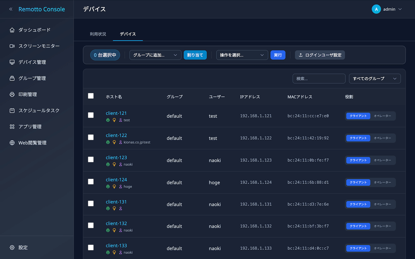 登録されたすべてのデバイスがテーブルで表示されます。各行にはホスト名、グループ、ログインユーザー、IPアドレス、MACアドレス、ロールが表示されます。