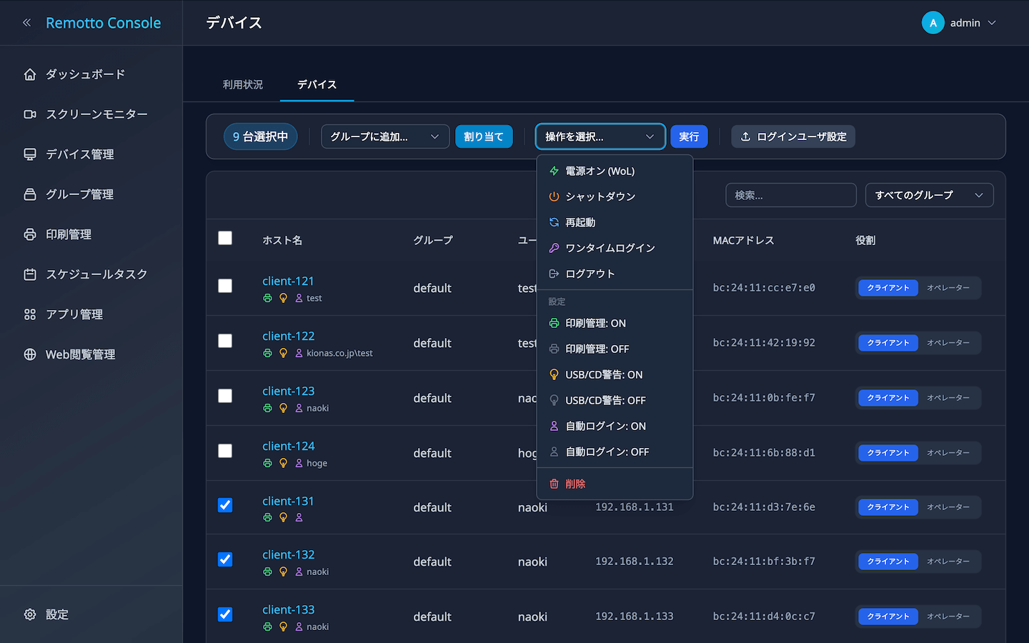 - 一括操作: チェックボックスで複数端末を選択し、電源操作・グループ割り当て・設定変更・削除をまとめて実行