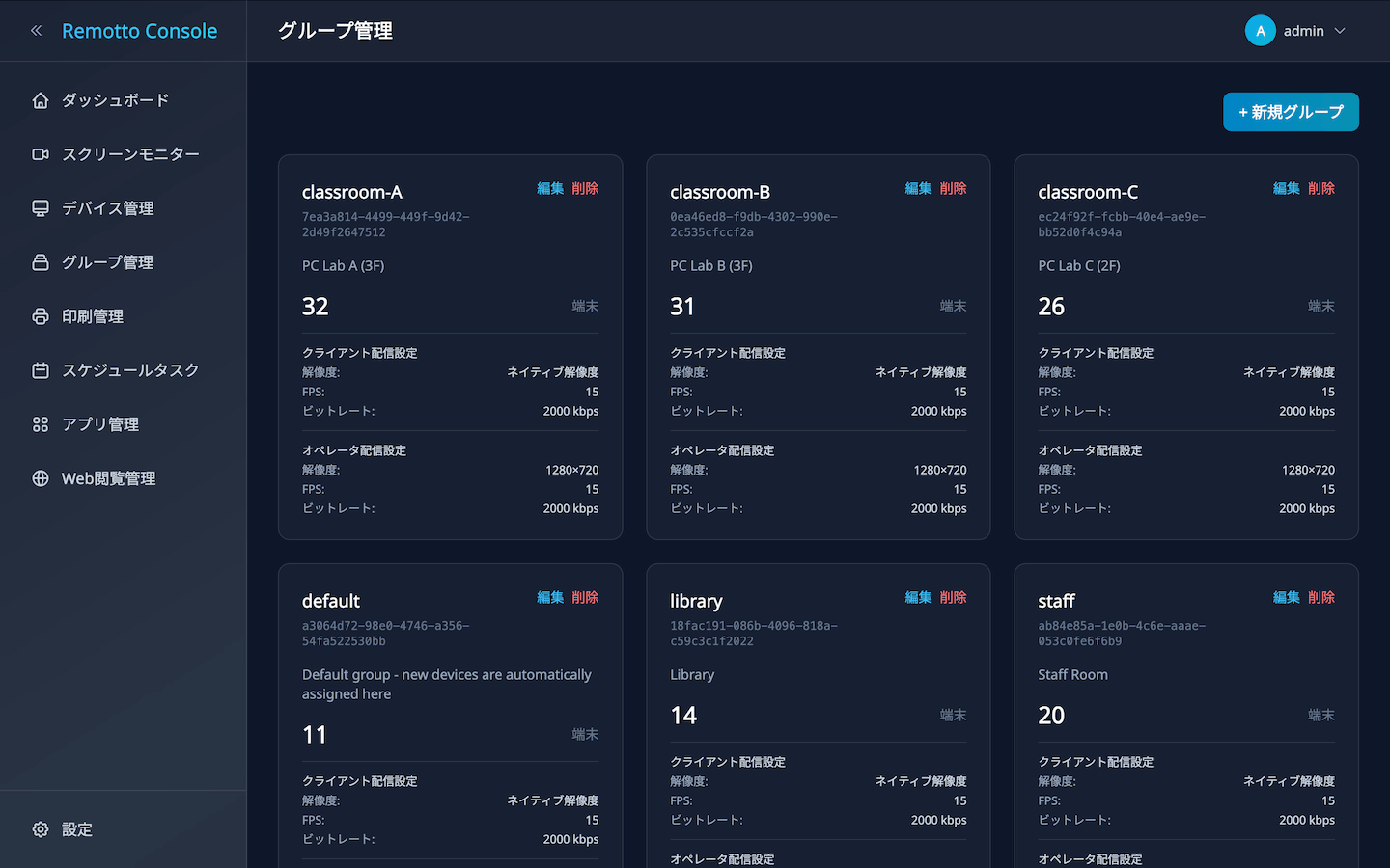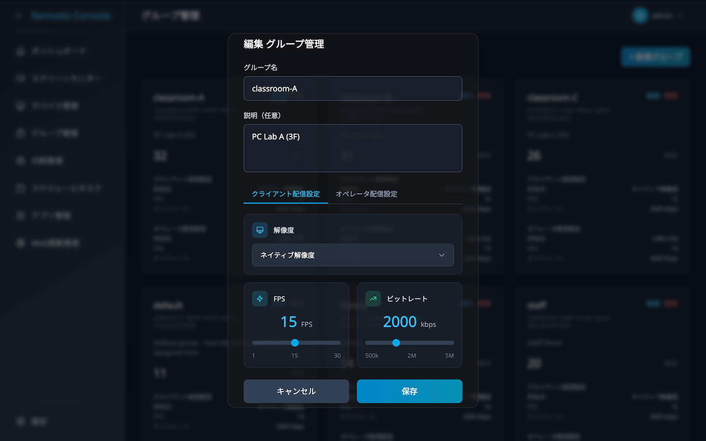 デバイスをグループに分類して管理できます。グループごとにストリーミング配信品質を設定し、所属する全端末に一括適用します。
