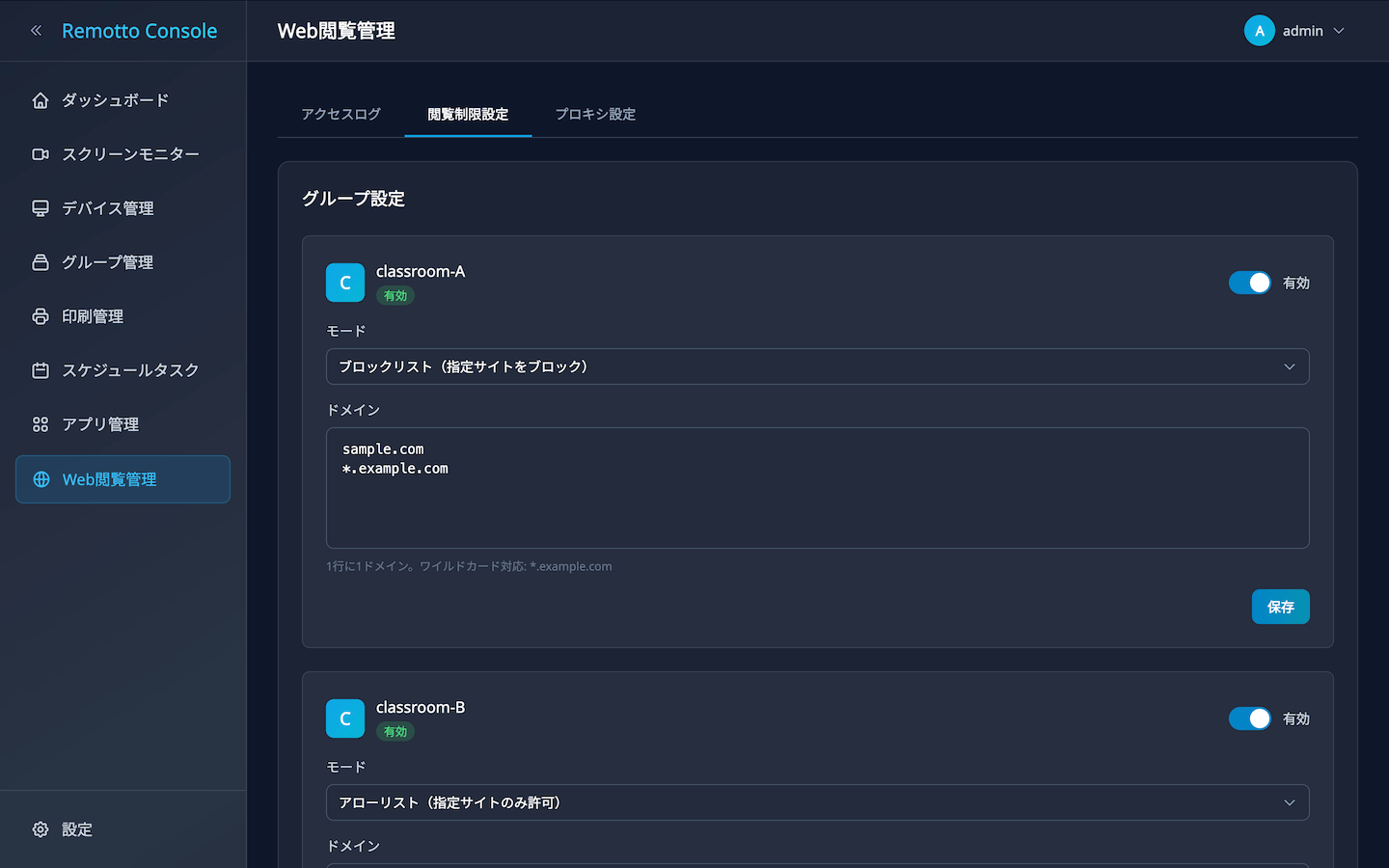 業務・学習用サイトのみ許可し、それ以外はブロック。