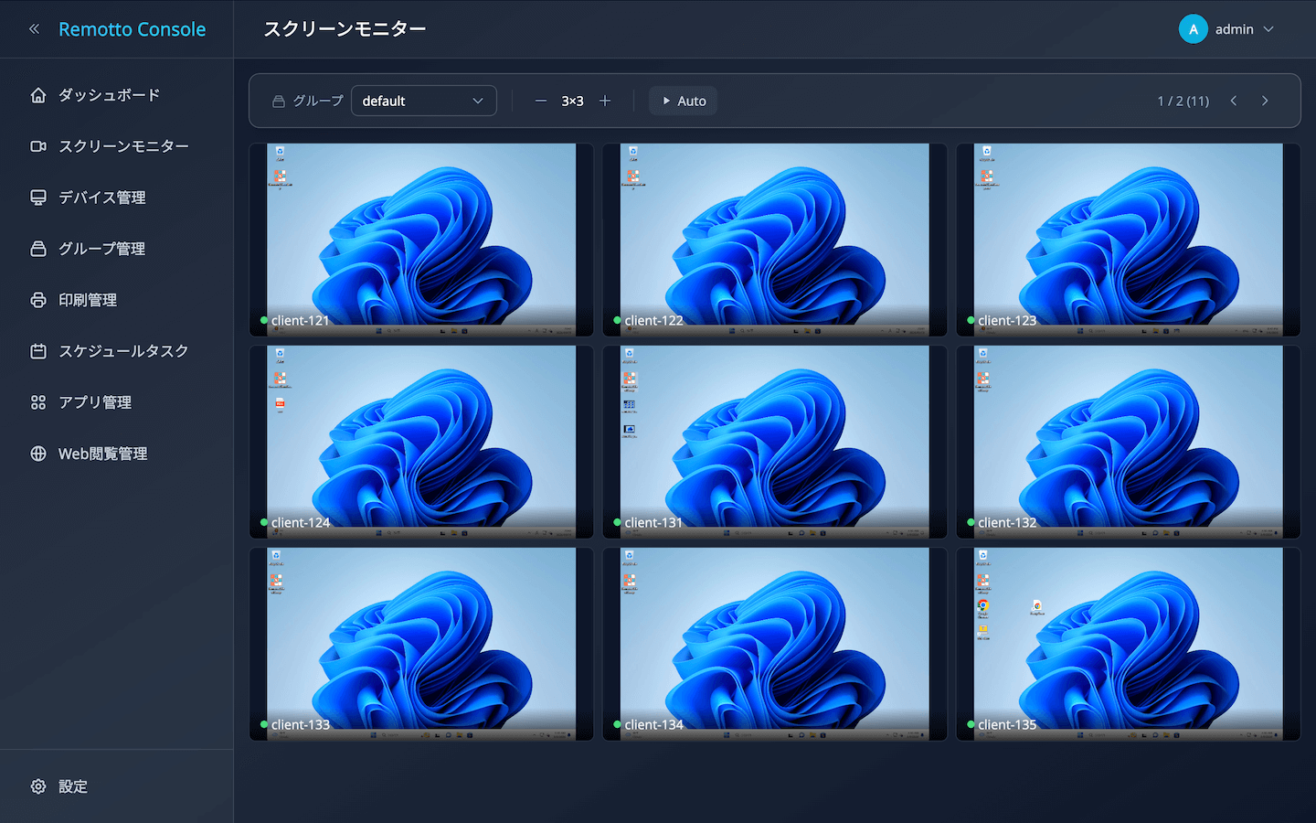 管理コンソールの「モニター」画面から、ブラウザ上でクライアント端末の画面をリアルタイムに監視できます。Remotto Viewerをインストールしなくても、ブラウザだけで画面確認が可能です。